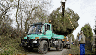 Emig se especializou nesse tipo de atividade e é responsável pelo transporte das árvores. Seu assistente absolutamente essencial é seu novo Unimog U 400. O veículo tem PBT de 11,99 toneladas e 286 cavalos. Com sua capacidade de trafegar em marcha reduzida, a uma velocidade de somente 1,5 km/h, seu chassi off-road e seus grandes pneus permitem que o Unimog faça o transporte em qualquer tipo de terreno. Sua largura de 2,30 metros e sua boa capacidade de manobra garantem a circulação do veículo em áreas urbanas, com vias de acesso estreitas.