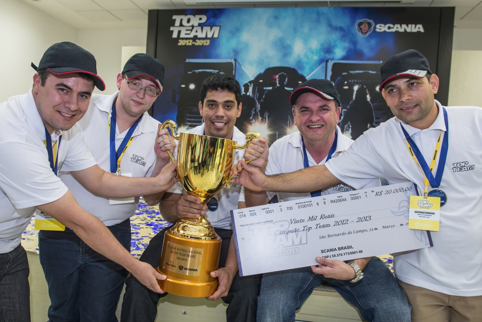 Ricardo Bochnia, Antonio Sergio Pereira, Marlon da Silva, Luis Fernando Londero e Alexandre Bernardino Martins são os melhores profissionais de serviços da rede Scania no Brasil. A equipe da Casa Scania Battistella de São José dos Pinhais (PR) foi a vencedora, no fim de semana, da Final Nacional Brasil da competição Top Team 2012-2013. Em junho, o time disputará com outros cinco países duas vagas que darão direito a participar da final internacional, em novembro na Suécia.