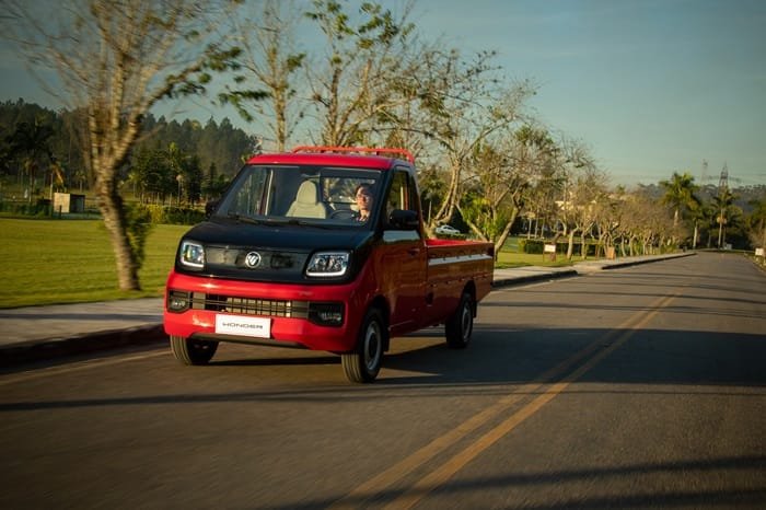 A transmissão é manual de cinco velocidades, também da Harbin Dongan Automobile Power, que proporciona controle total ao motorista, enquanto a suspensão reforçada assegura uma condução suave e estável, independente da carga transportada.