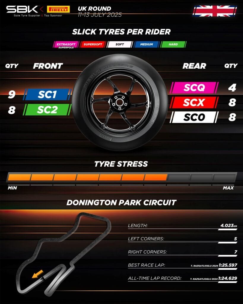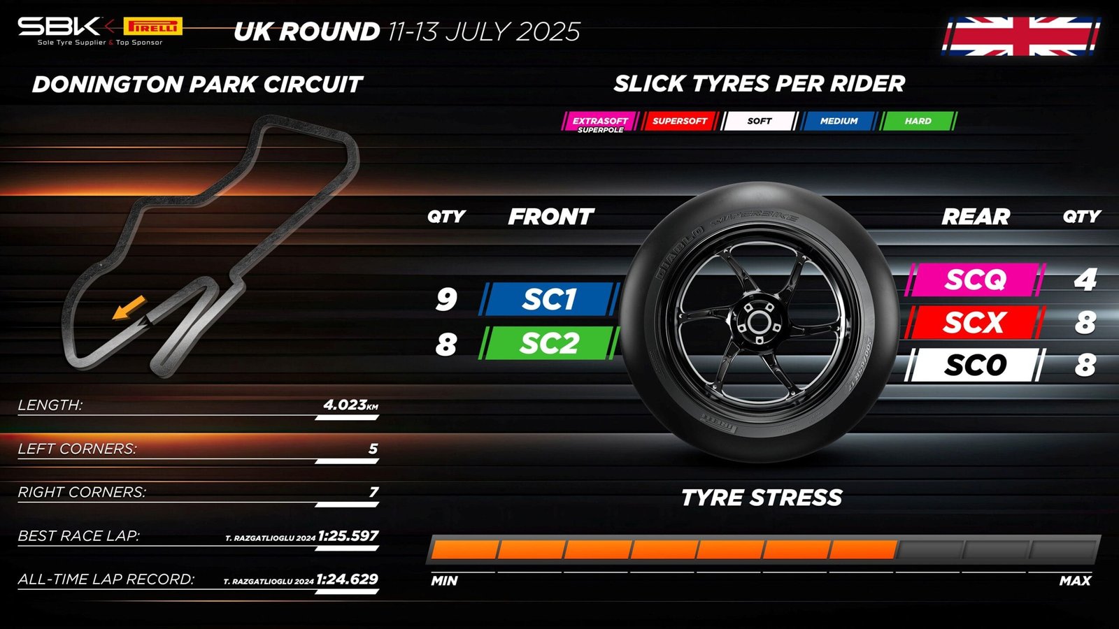 O Campeonato Mundial de Superbike da FIM entra oficialmente em sua segunda metade da temporada com a realização da etapa no tradicional circuito de Donington Park, no Reino Unido. As características do traçado, combinadas com a instabilidade climática típica da região, tornam a escolha dos pneus um fator estratégico para as equipes, especialmente com a alocação oferecida pela Pirelli baseada exclusivamente em soluções padrão.