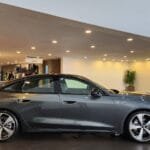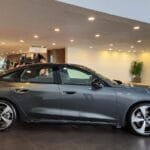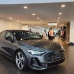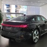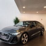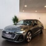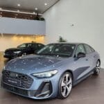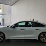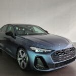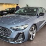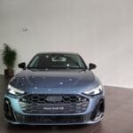 Visualmente, o A5 segue a nova estética da marca: superfícies limpas, vincos suaves e perfil escultural. A dianteira possui faróis redesenhados e grade singleframe com padrão favo de mel tridimensional. As rodas Audi Sport de 20 polegadas acompanham pneus 245/35, com cinco braços Falx e acabamento em cinza acetinado fosco.