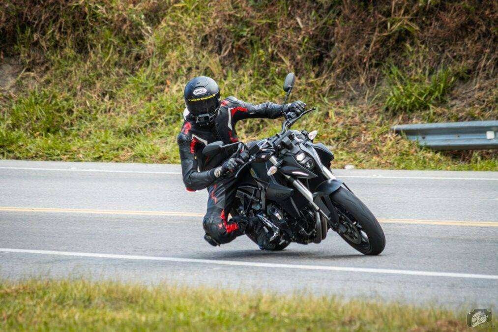 Durante o percurso, o comportamento do chassi se mostrou consistente. A estrutura em liga de aço, combinada com suspensão dianteira invertida KYB e monoamortecedor traseiro, permitiu absorção eficiente das irregularidades do asfalto. A motocicleta manteve trajetória firme nas curvas, mesmo em velocidades moderadas. O sistema de freios, com discos de 310 mm na dianteira e 240 mm na traseira, respondeu com precisão nas reduções de velocidade exigidas pelas curvas da SP-360.