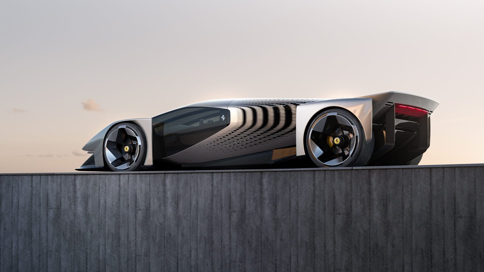 As laterais trazem cortes verticais inspirados no F80, evidenciando a influência do novo vocabulário técnico-estilístico sobre futuros modelos de produção. A linguagem visual se manifesta no contraste entre linhas técnicas das asas e a forma escultórica da carroceria, aprimorada por algoritmos generativos.