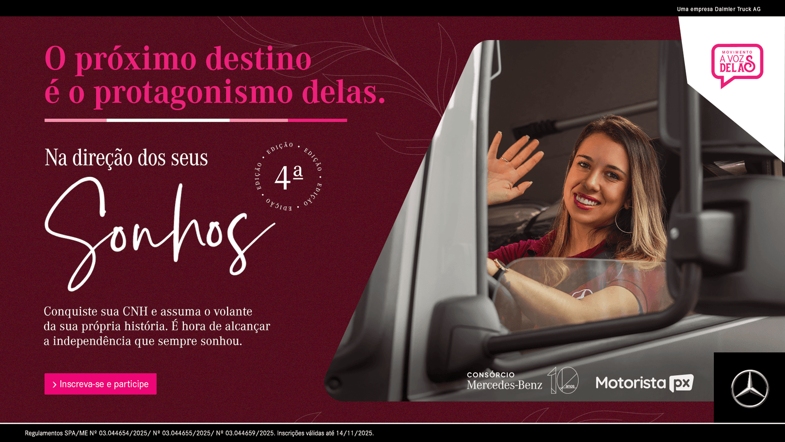 A promoção “Na Direção dos Seus Sonhos” reforça o compromisso da Mercedes-Benz com a diversidade e com a criação de caminhos para que mulheres possam ingressar no transporte rodoviário de cargas. O regulamento completo está disponível na aba “Ações e Promoções” do site https://avozdelas.com.br/.