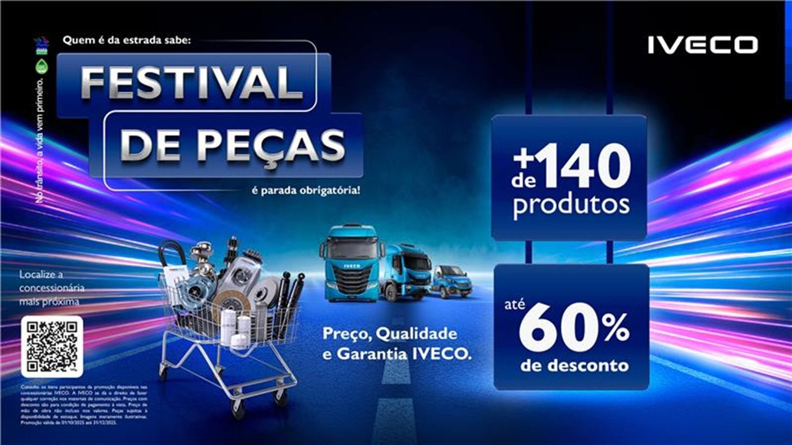 A campanha promocional da Iveco para caminhões e ônibus começou nesta quarta-feira, 1º de outubro, e se estende até 31 de dezembro de 2025. O Festival de Peças retorna com mais de 140 itens disponíveis, entre Peças Genuínas e da linha NEXPRO, com descontos que chegam a 60%. A ação ocorre em toda a rede de concessionários da marca na América Latina.