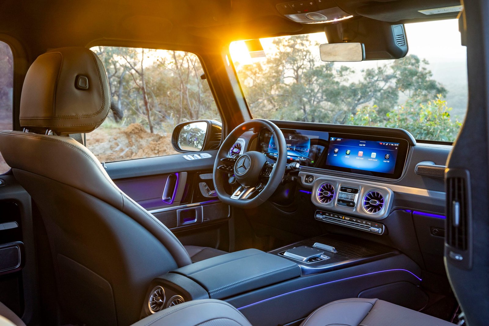 Internamente, o modelo mantém os recursos tecnológicos da linha G, como o volante AMG Performance em couro Nappa, sistema multimídia MBUX com navegação em realidade aumentada, som Burmester® 3D, carregamento sem fio para smartphones e porta-copos com controle de temperatura. Sistemas de assistência ao condutor completam o pacote.