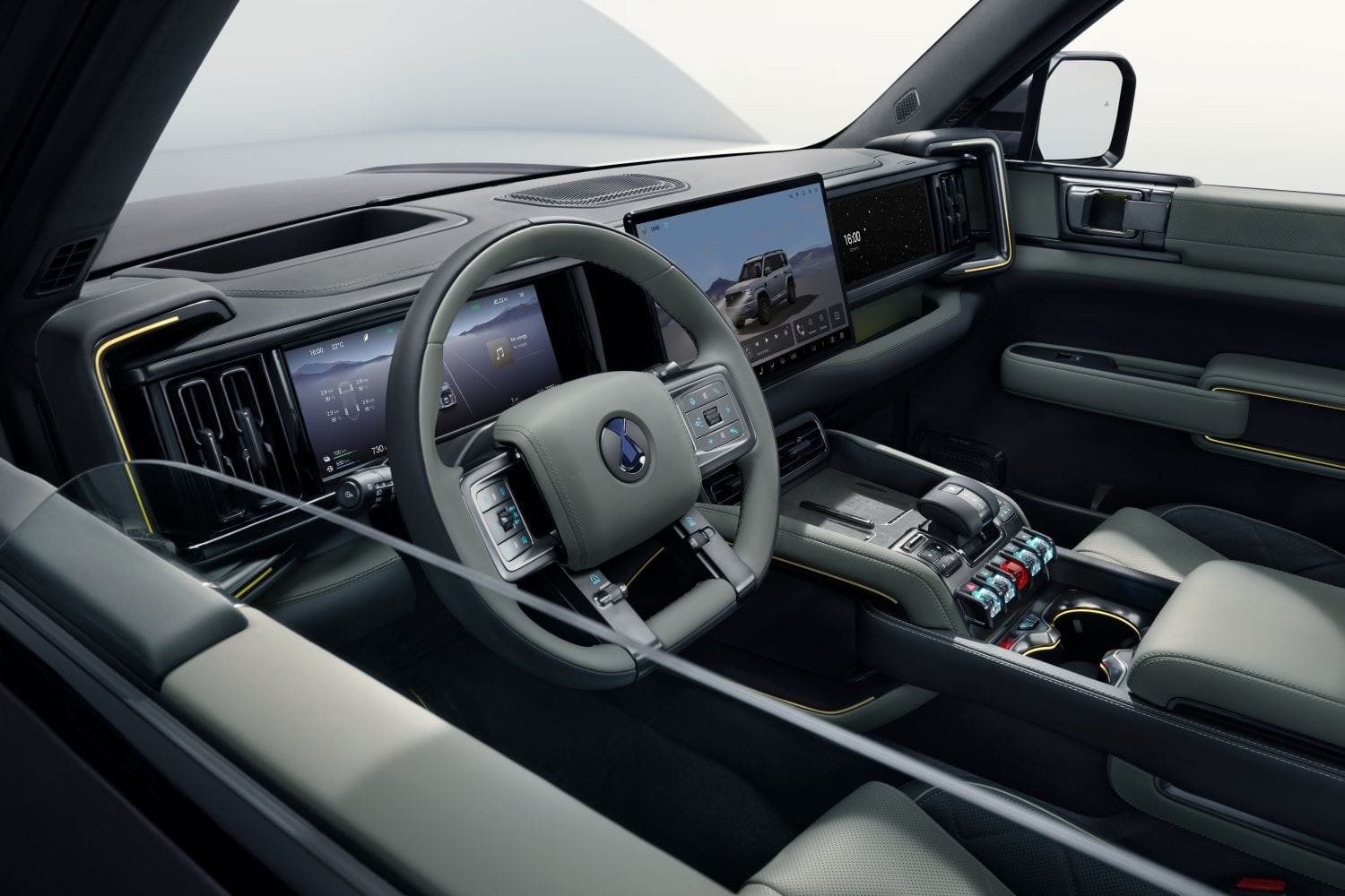 O modelo conta com plataforma DMO, autonomia combinada de até 1.200 km no ciclo CLTC e aceleração de 0 a 100 km/h em 4,8 segundos. A robustez off-road é garantida pela construção sobre chassi, sistema híbrido de tração integral 4×4 e três bloqueios de diferencial. A capacidade de reboque é de até 2.500 kg, com 16 modos de condução disponíveis. A suspensão ativa DiSUS-P integra mais de 20 sensores para controle hidráulico da carroceria e aprimoramento da segurança.