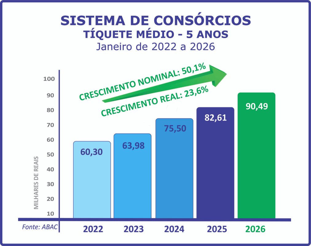 Ao analisar o desempenho dos tíquetes nos meses de janeiro nos intervalos dos últimos cinco anos, observou-se valorização nominal de 50,1% na evolução dos valores médios registrados. Ao descontar a inflação (IPCA) de 21,4% do período, na relação da diferença de R$ 60,30 mil, de janeiro de 2022, para R$ 90,49 mil, no mesmo mês de 2026, houve elevação real de 23,6%.