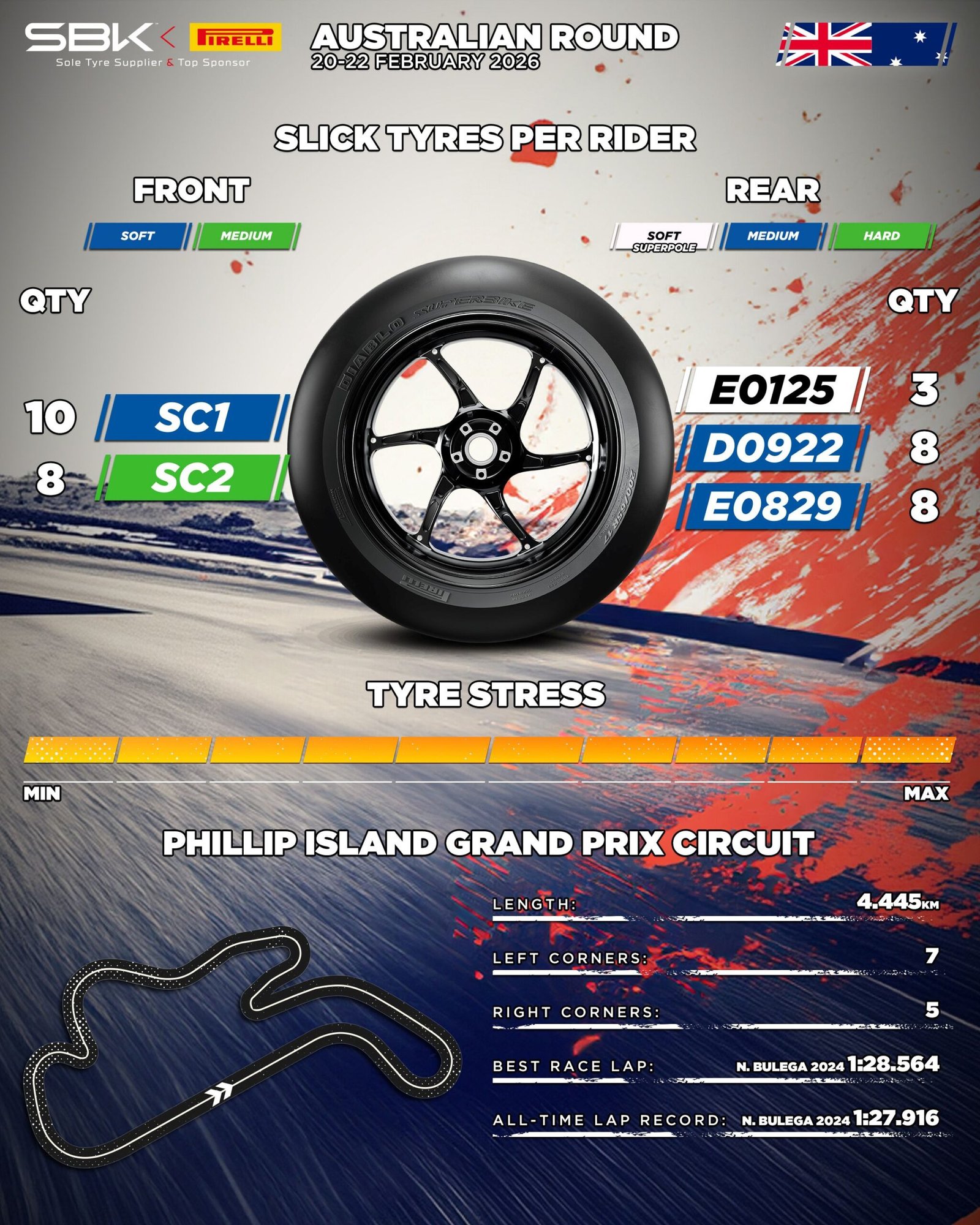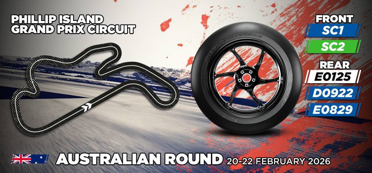 A Pirelli revelou os pneus que serão utilizados na primeira etapa do Campeonato Mundial de Superbike (WorldSBK) 2026, que acontece em Phillip Island Grand Prix Circuit, na Austrália. A vigésima terceira temporada da fabricante como fornecedora exclusiva da competição começa após dois dias de testes de pré-temporada, nos quais Nicolò Bulega, no WorldSBK, e Jaume Masiá, no WorldSSP, se destacaram com os melhores tempos.