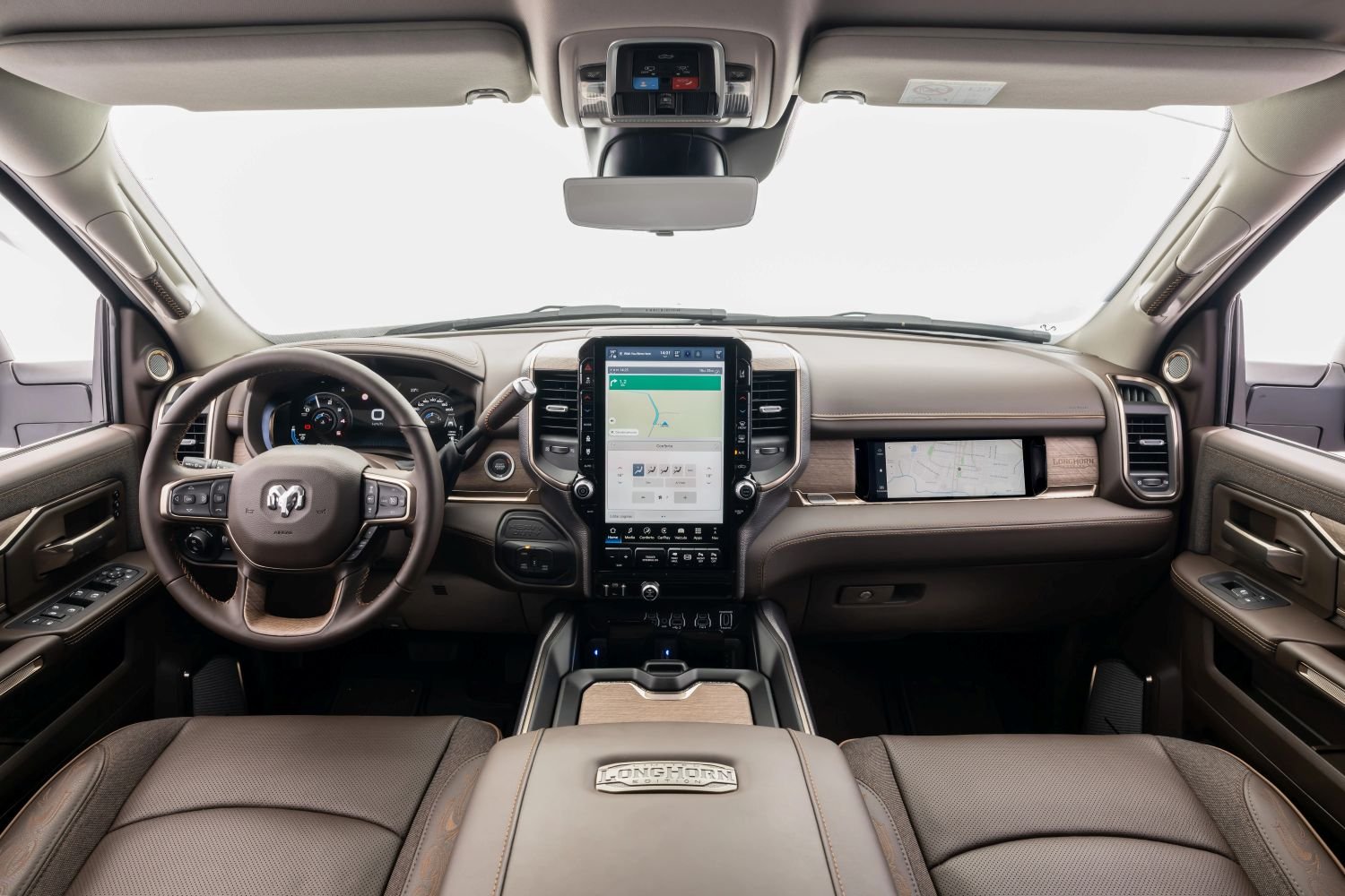 Internamente, a Ram 3500 Limited Longhorn representa o topo da gama da marca no Brasil. O modelo oferece bancos de couro com design exclusivo, acabamento em madeira legítima e detalhes artesanais distribuídos pela cabine. O retrovisor digital 3.0, capaz de projetar diferentes pontos de vista, amplia a visibilidade do condutor em situações de reboque de trailers ou implementos.