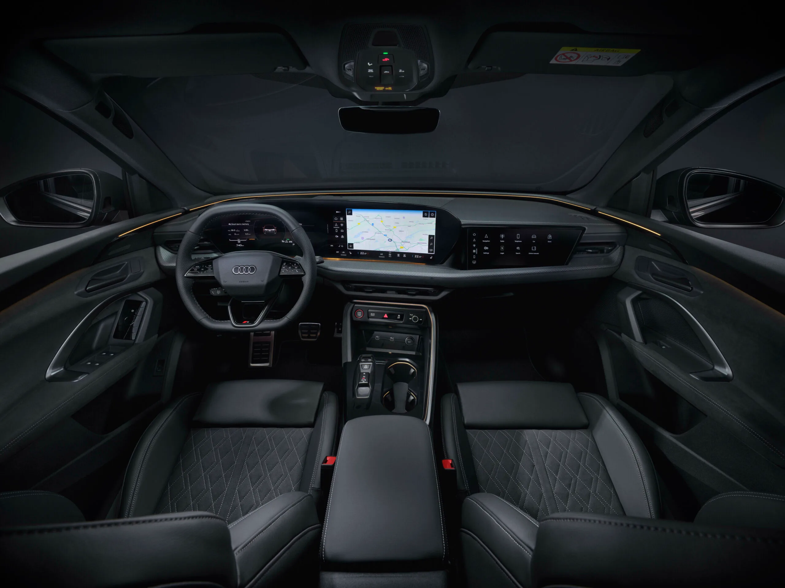 Internamente, o modelo adota o conceito de palco digital, com duas telas: o display MMI-touch de 14,5 polegadas e o painel Audi Virtual Cockpit de 11,9 polegadas. Os bancos dianteiros possuem ajustes elétricos e apoio lombar em quatro vias. O sistema Audi Drive Select permite diferentes modos de condução, e o pacote de Luz Ambiente plus oferece 30 opções de cores.
