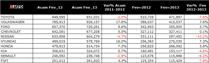 A Volkswagen segue em 2º lugar nas vendas do ano, com 5,45% de veículos se comparado a 2012. A Ford também manteve sua 3ª colocação e crescimento de 10,91%. Destaque para as marcas japonesas, Nissan e Honda, que apresentaram uma recuperação expressiva nas vendas de dezembro de 18,65% e 20,96% se comparado a igual período do ano passado, respectivamente.