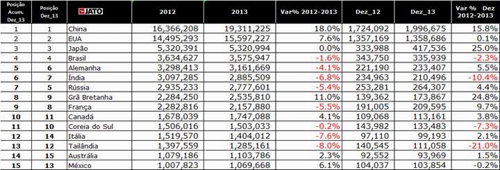 A JATO Dynamics do Brasil, líder em fornecimento de informações automotivas, divulga seu release mensal com fechamento dos dados de veículos vendidos mundialmente em 2013. A China encerra o ano na 1ª posição com crescimento expressivo de 18% e mais de 19 milhões de veículos comercializados. Os EUA seguem em 2º lugar com 15,5 milhões de unidades vendidas e alta de 7,6% em relação 2012. O Japão se mantém na 3ª colocação, registrando o mesmo índice do ano passado.