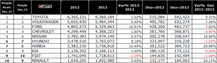 A Toyota terminou o ano na 1ª colocação com alta de 1,02% e com mais de 6 milhões de veículos vendidos mundialmente no ano de 2013.